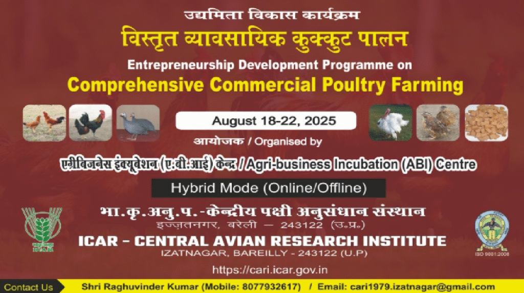 इस कार्यकृम के विषय मे अधिक जानकारी व ऑनलाइन पंजीकरण के लिए https://icar-cari.blogspot.com/2025/04/edp-on-comprehensive-commercial-poultry.html पर संपर्क किया जा सकता है.